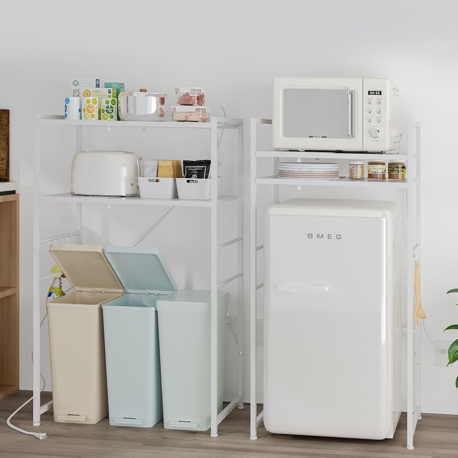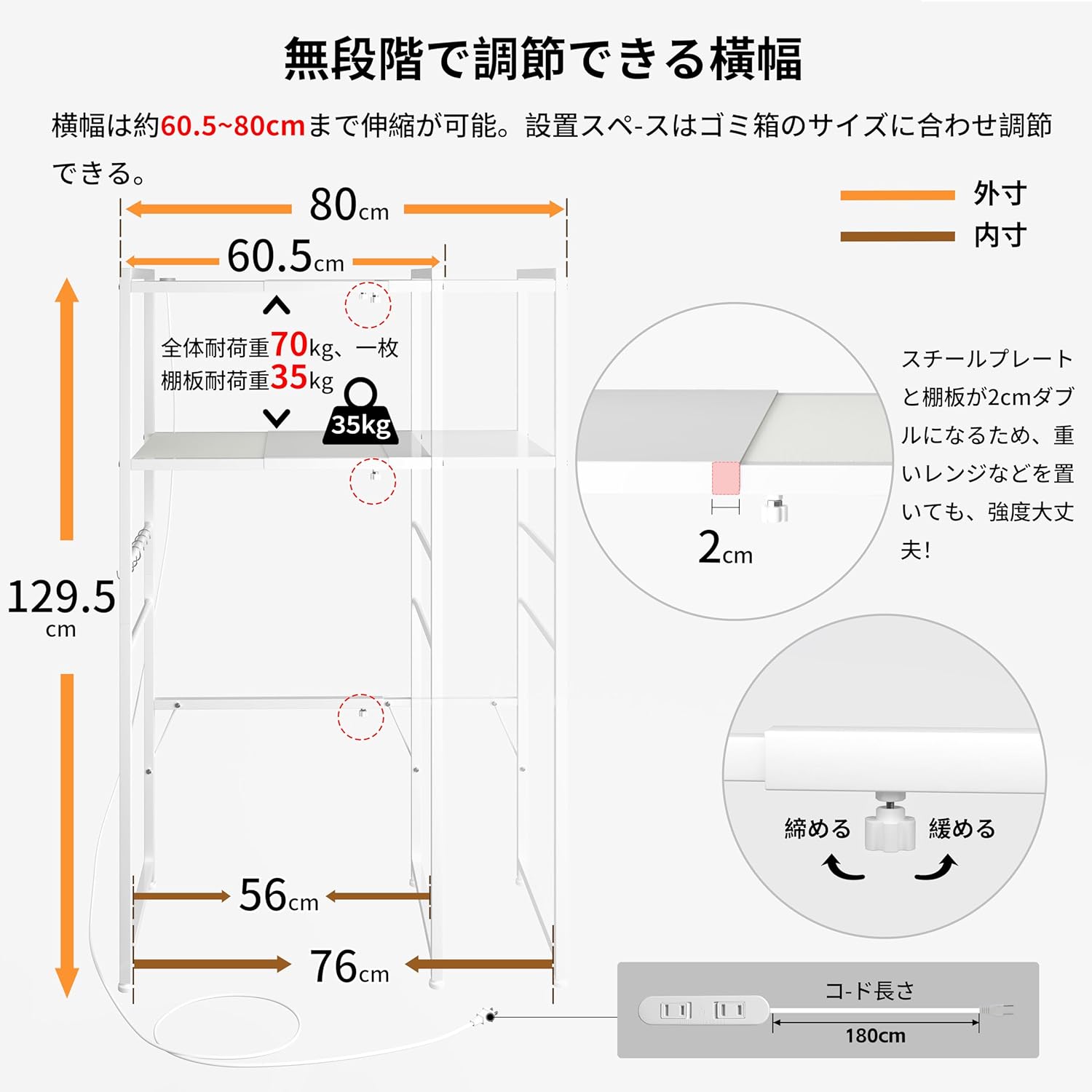 幅60.5から-80まで*奥行42*高さ129.5cm 多機能横幅伸縮できるコンセント付きキッチンベイカーラック、キッチンラック、レンジ台、オーペンラック、ゴミ箱収納、プリント台ラック、可動式棚板多段調整、Sフック付き、荷重70kg、錆び防止、耐摩擦性、耐水性、耐熱性機能がある。 (ホワイト)