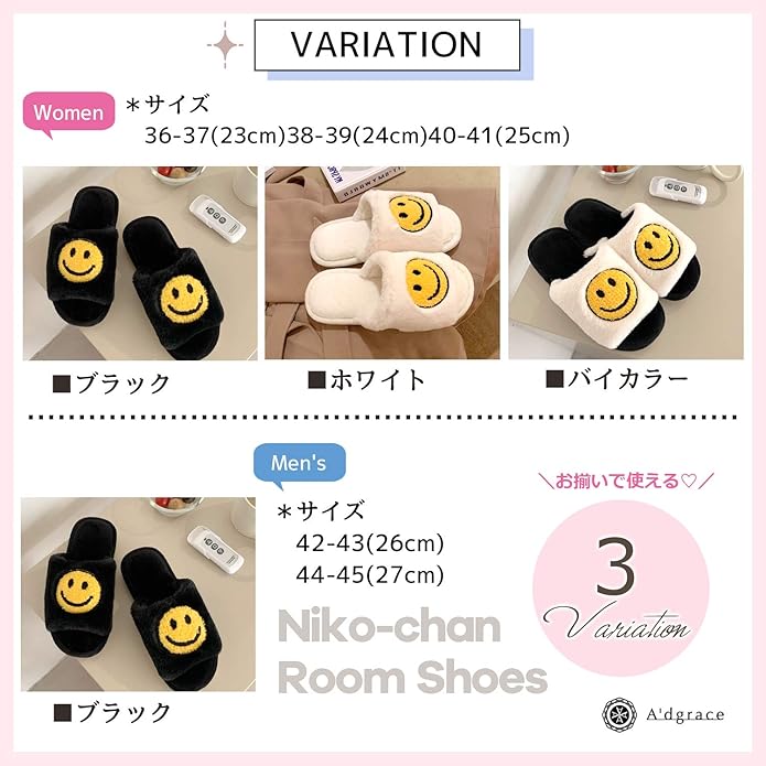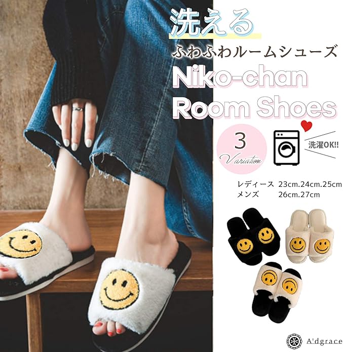 ニコちゃんマーク スリッパ ルームシューズ 洗える ふわふわ 防水 ペア 3色23~27cm