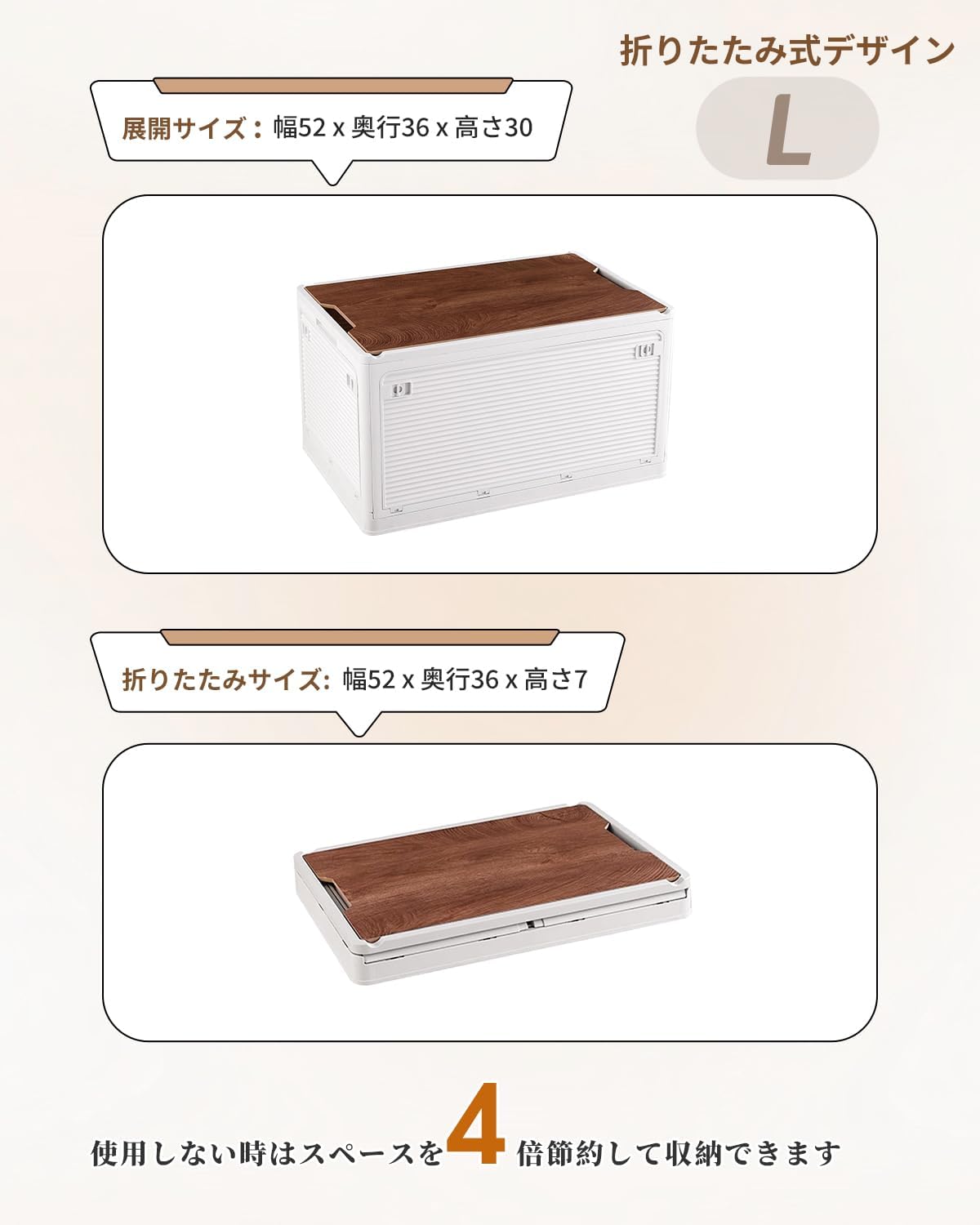 55.6L容量 木製蓋付き アウトドア 収納ケース 5面開き コンテナ ボックス キャンプ 全方向から取り出せる 折りたたみ 収納コンテナ 省スペース 衣装ケース 衣装収納ケース 収納箱 キャスター付き 強い耐荷重 大容量 キャンプ用 家庭用 オフィス用 車用 防塵 防湿 無臭 多用途(1段 分離使用可能) (Lサイズ 52×36×30cm)