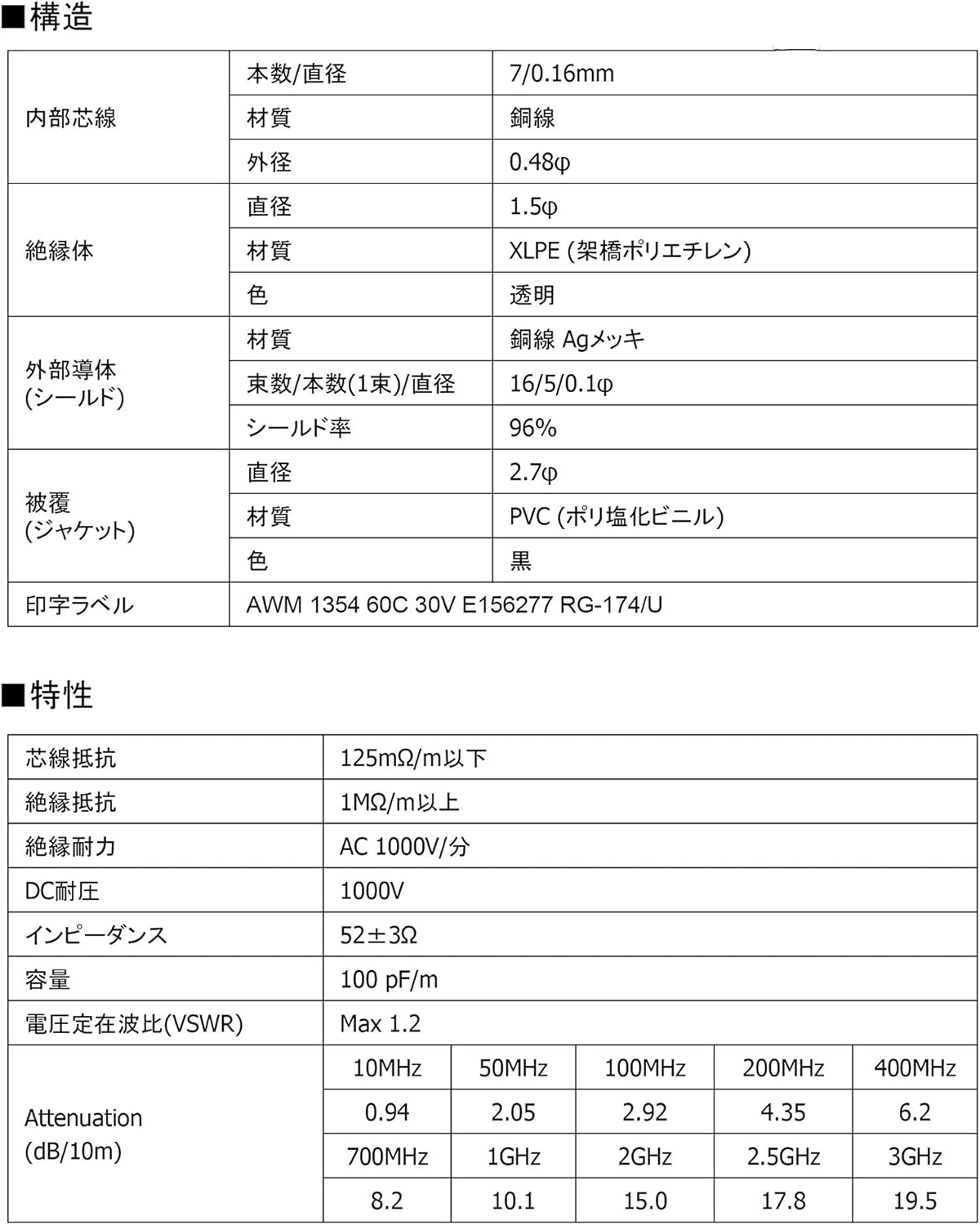 RG174 RF 同軸ケーブル