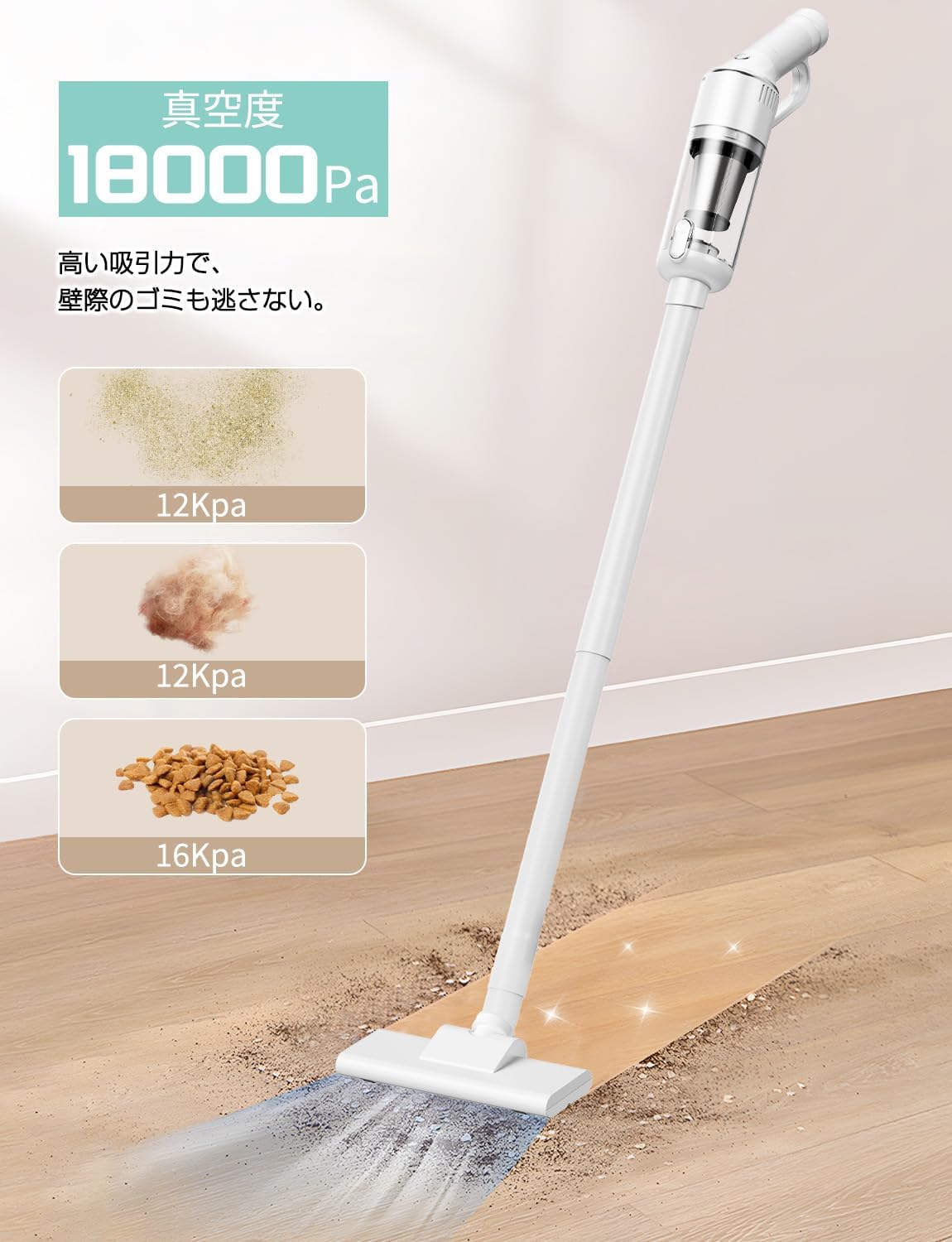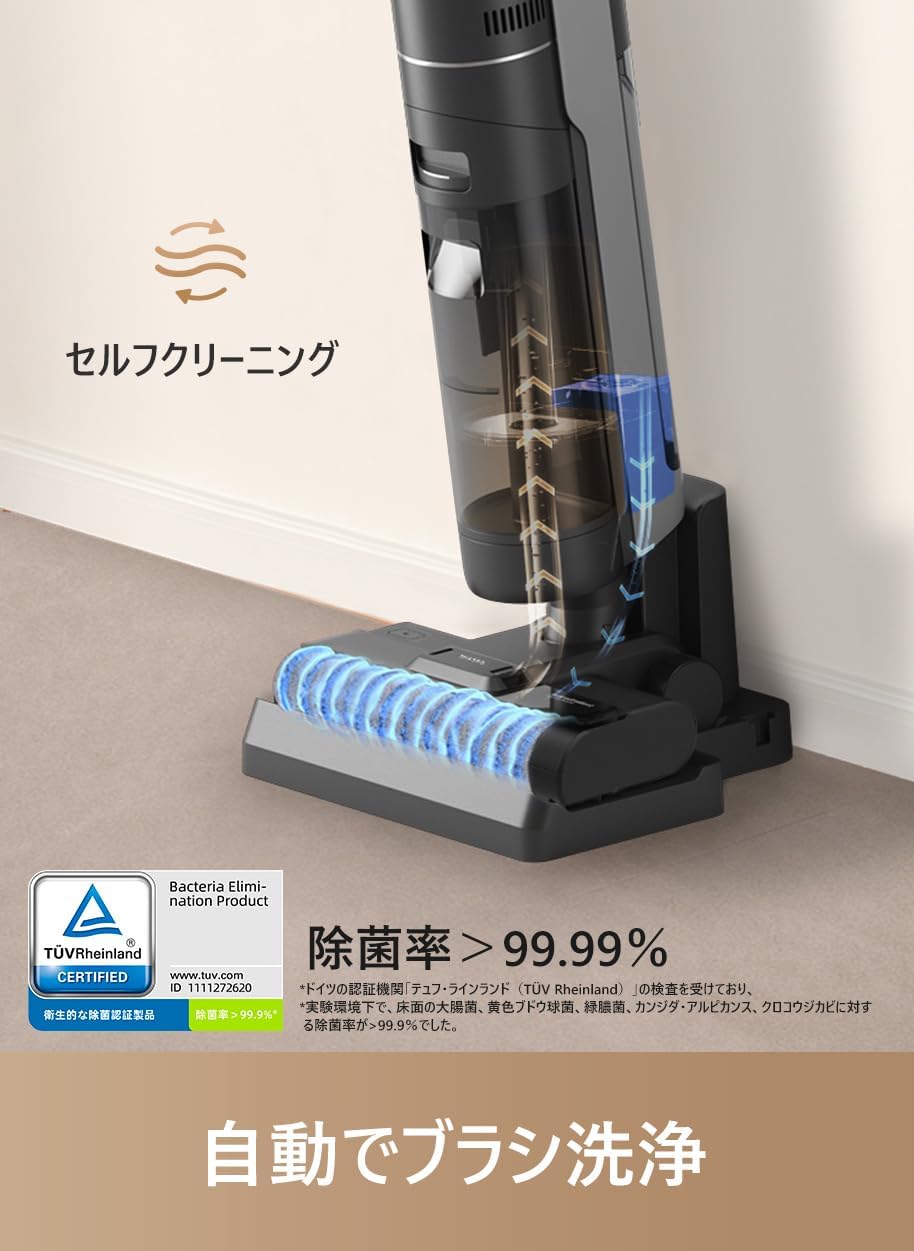 ブラシ自動洗浄と温風乾燥 除菌 壁際まで届くブラシ設計 16000Pa強力吸引