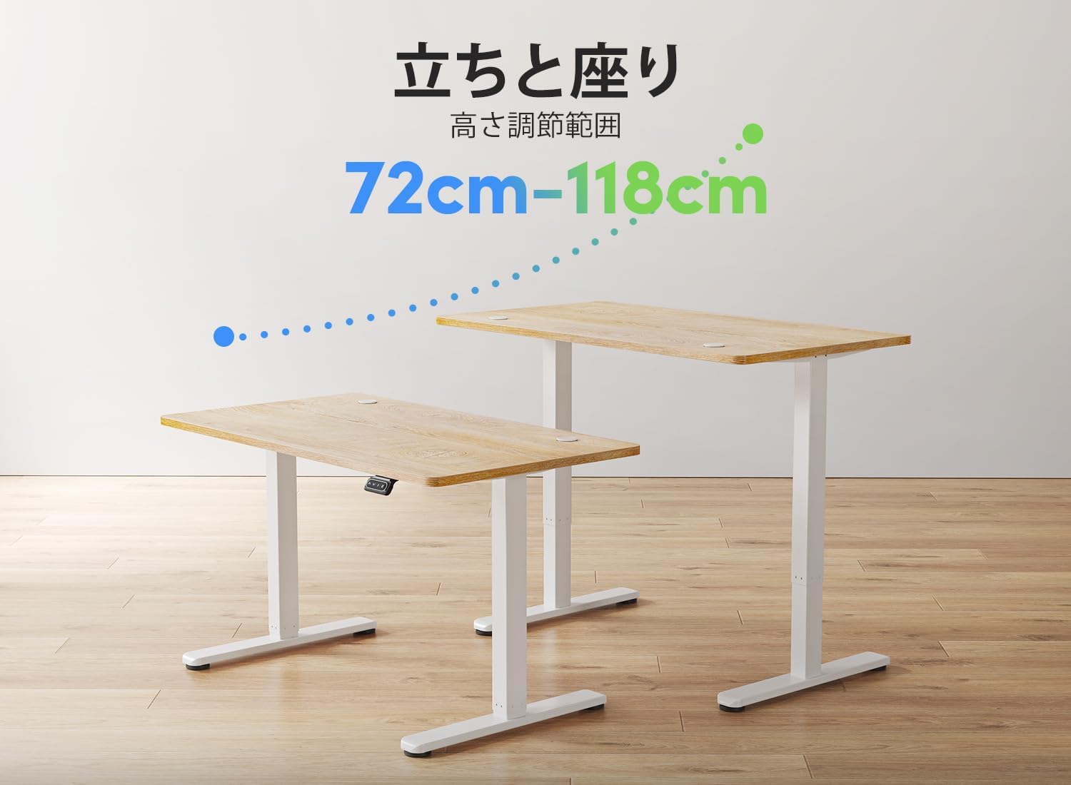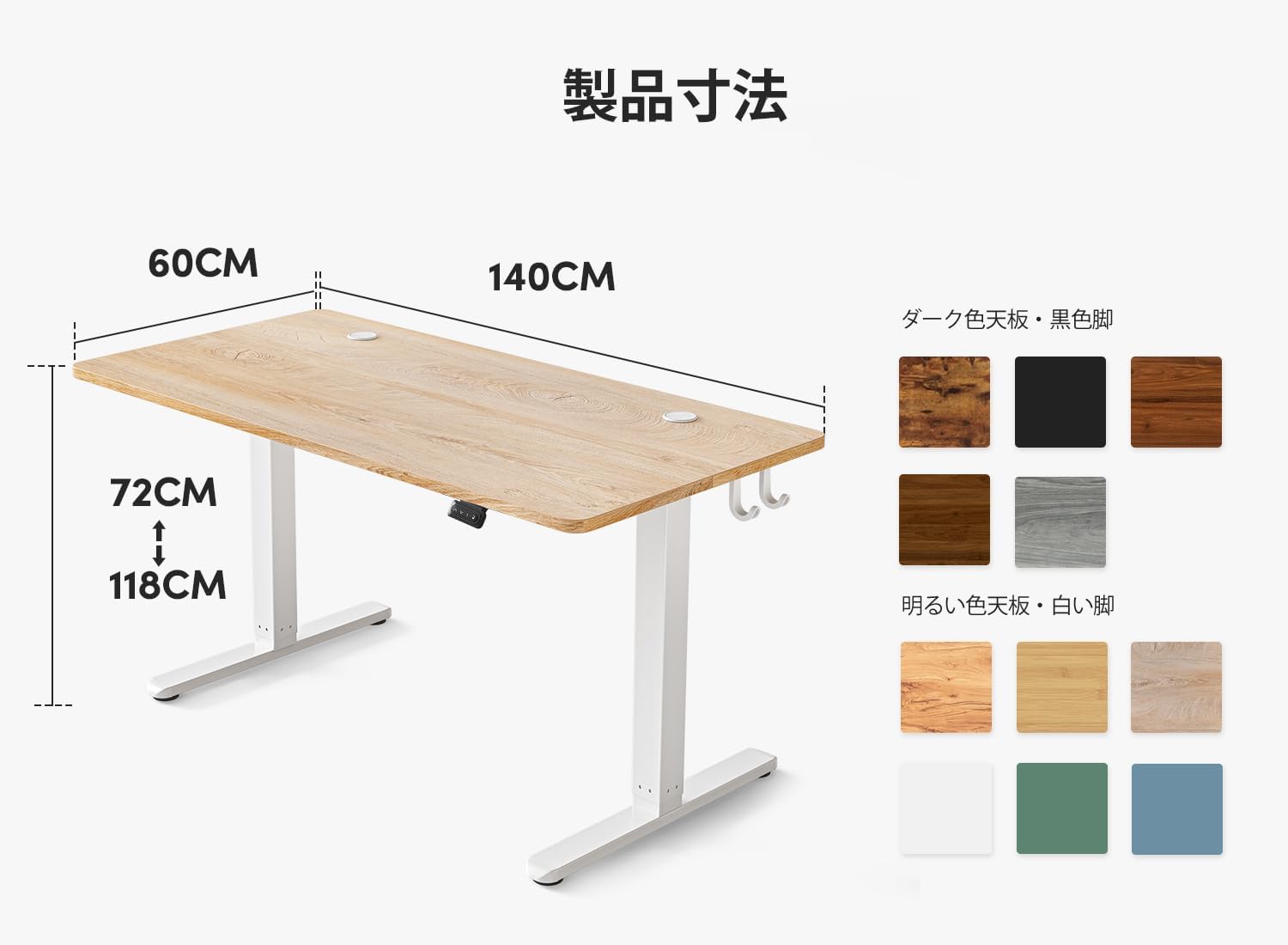 上下昇降デスク 高さメモリー機能 静音 衝突検知 収納フック付き