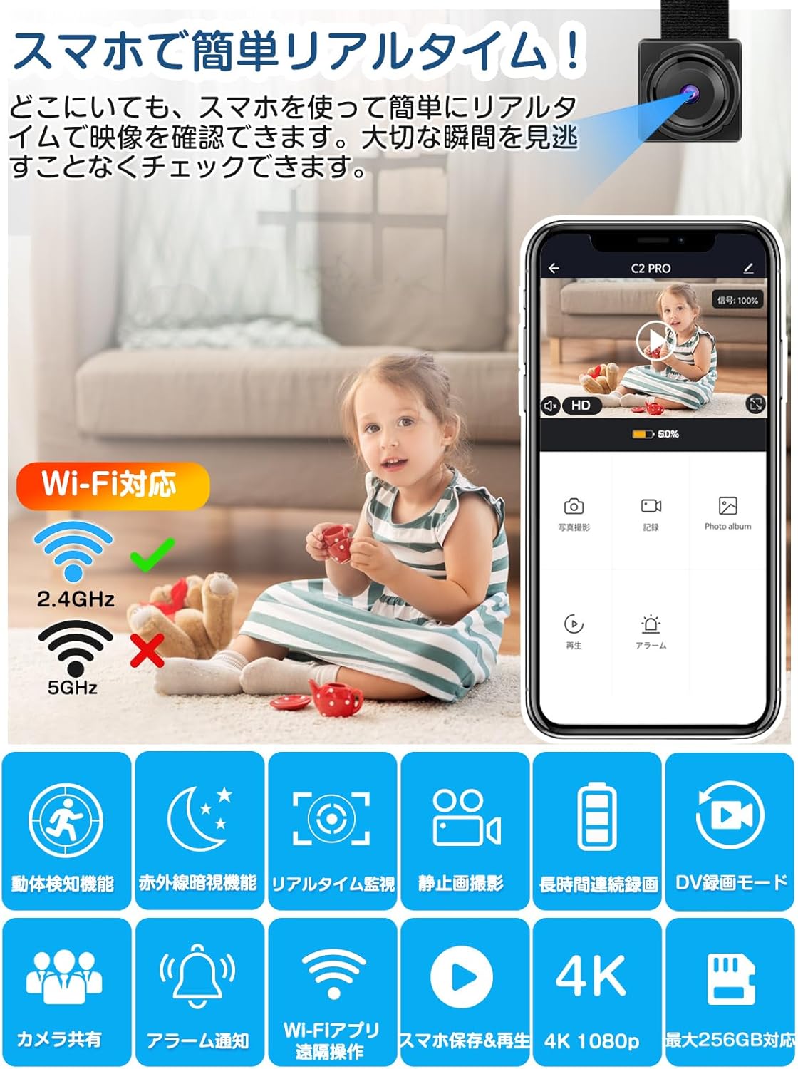 WIFI 小型カメラ 防犯カメラ 充電式 4K CM0598