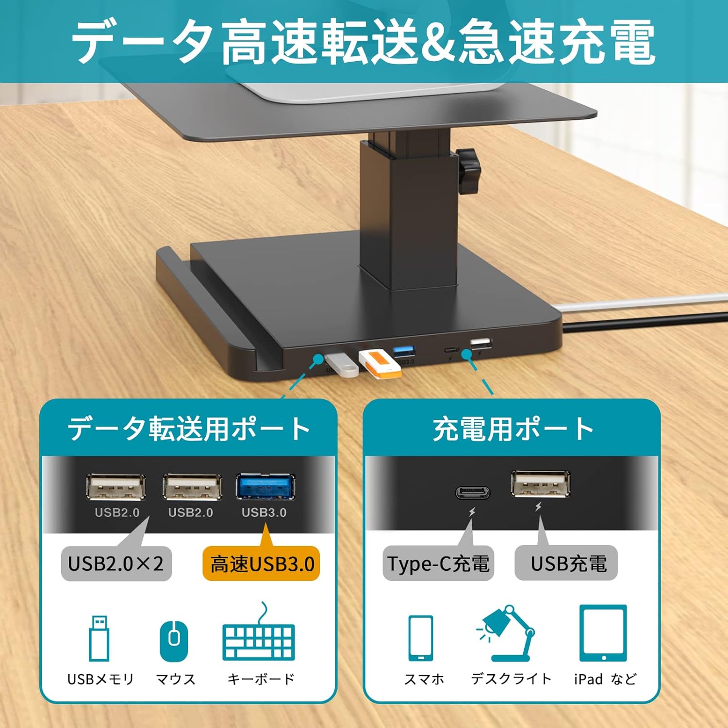 高さ調整 机上台 USB HUBと充電器付き 金属製ディスプレイ 台 ノートパソコン、PC、iMac