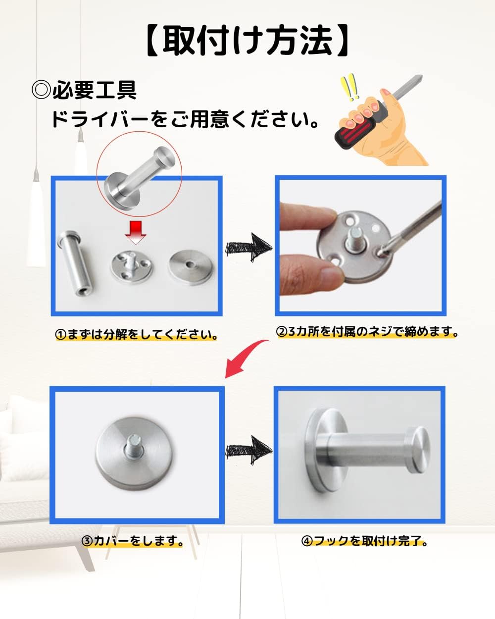 壁掛けタイプ シンプルデザイン DIY用 ハンガー ネジ取り付け可能 シルバー色 (10cm×4本)