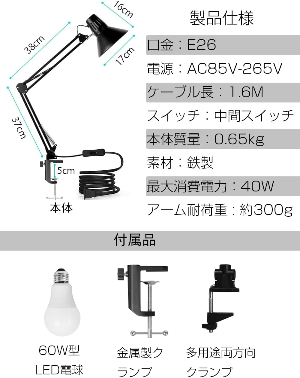 LED スタンド E26 スイングアームライト クランプ式 LEDデスクライト 目に優しい